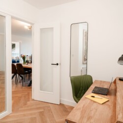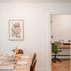 The dining area has an elegant table for 6 people that can also double up as a workspace. Crockery, cooking utensils, cutlery, glassware and place mats are all included for guests’ convenience.